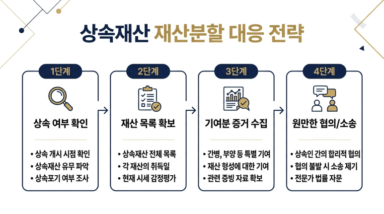 재산분할에서 가장 중요한 것은 상속 개시 시점입니다. 피상속인의 사망일자, 혼인신고일, 이혼 소송 제기일을 비교해 상속재산이 언제 형성되었는지 명확히 해야 합니다. 또한 배우자 기여분을 주장하려면 재산 관리 증거, 리모델링 영수증, 임대료 관리 내역, 세금 납부 자료 등을 확보해야 합니다. 상속 포기 여부도 확인해야 하는데, 남편이 상속을 포기했다면 재산분할 대상 자체가 사라집니다.