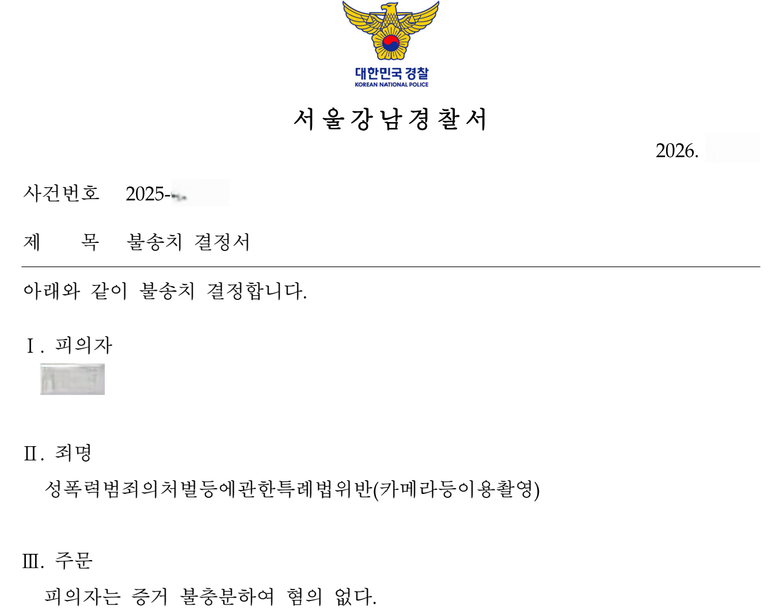 이 사건에서 촬영행위가 있었다고 인정할 객관적 증거가 부족하다는 이유로 불송치(혐의없음) 결정을 내렸습니다.