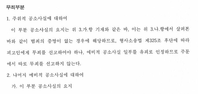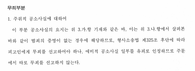재판부는 본 변호인의 주장을 사실상 대부분 수용했습니다. 즉, 주위적 공소사실에 대해서는 전부 무죄, 변경된 예비적 공소사실에 대해서도 (일부) 유죄를 인정하였습니다.