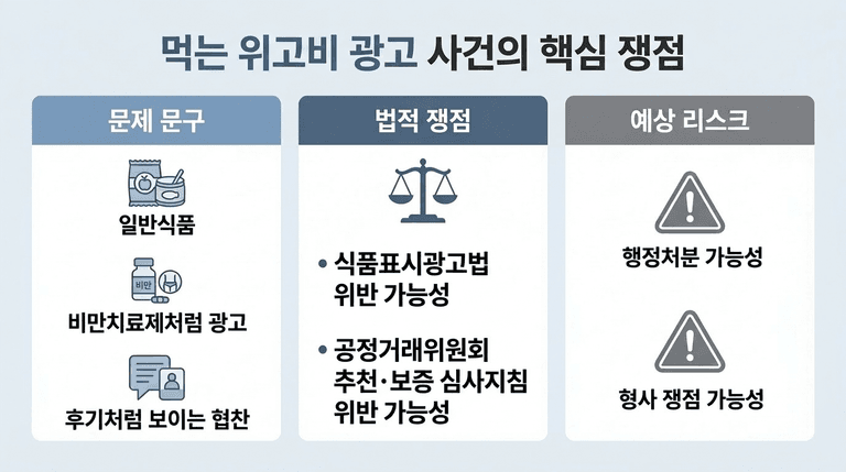 이 사건이 중요한 이유는 단순한 다이어트 유행 이슈가 아니라, 일반식품 광고가 어디서부터 의약품·건강기능식품 오인광고가 되는지, 후기형 광고와 공동구매가 어디까지 위험한지를 한 번에 보여주기 때문입니다.
