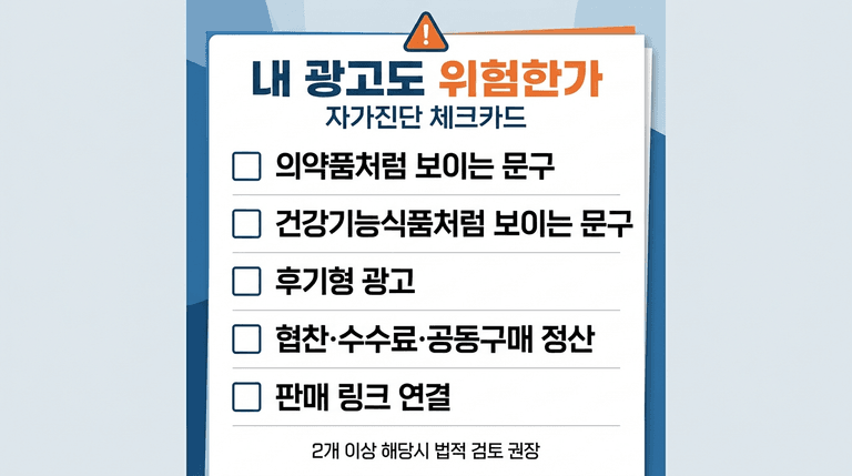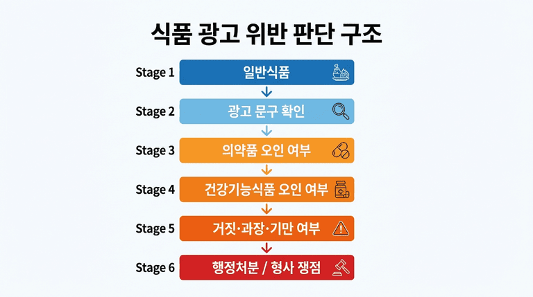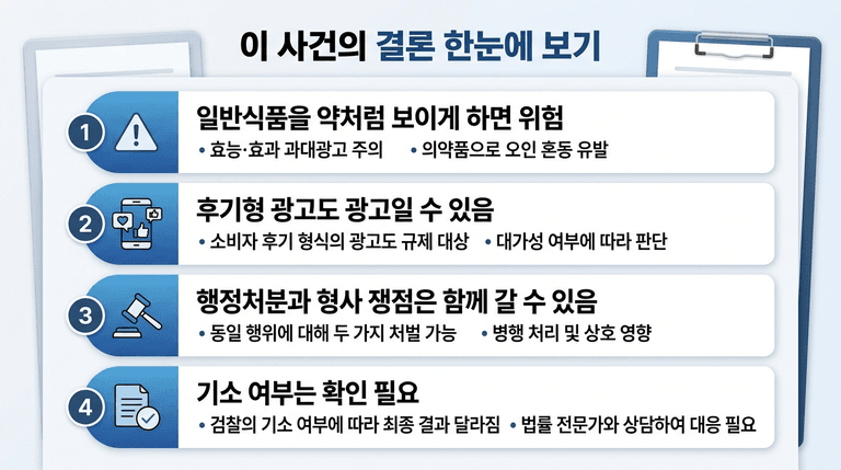 핵심은 “광고라고 안 썼다”만의 문제가 아닙니다. 광고 내용 자체가 일반식품의 법적 지위를 넘어섰는지, 그리고 후기 형식을 빌려 소비자를 오인시켰는지를 함께 봐야 합니다. 협찬 표시를 했더라도, 식품을 약처럼 보이게 한 표현이면 별도 위법 쟁점이 남습니다.
