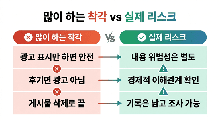 둘째, 후기 형식을 빌리면 광고가 아니라고 생각하는 것입니다. 이 사건 보도에서도 바로 그 구조가 문제로 제시됐습니다. 후기처럼 보여도 판매 유도 구조와 경제적 이해관계가 있으면 광고로 평가될 수 있습니다.