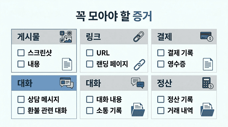 실무에서는 “게시물 삭제로 끝났다”고 생각하는 경우가 많은데, 광고 집행 흔적과 판매 정산 자료는 남습니다. 오히려 삭제만 해 두고 원본 보관을 안 하면 대응이 더 꼬입니다.