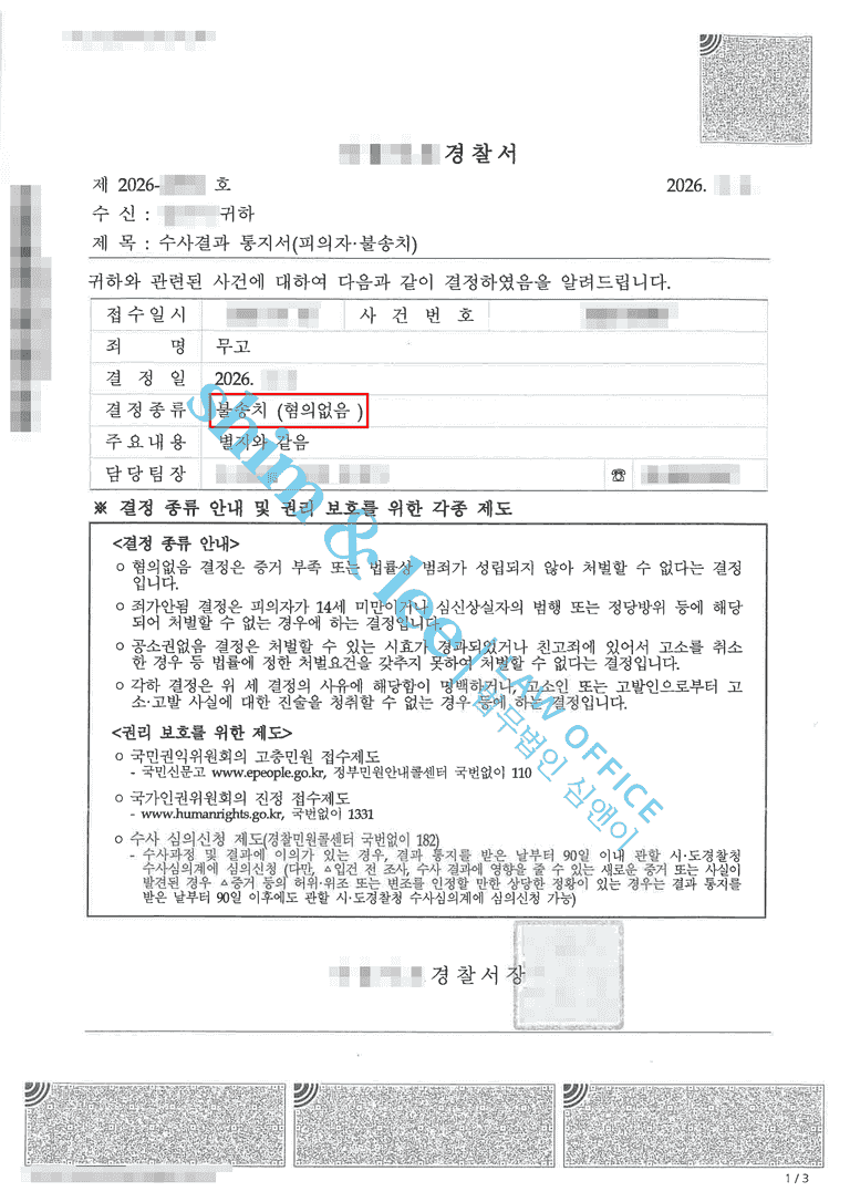 - 심앤이는 의뢰인이 가해자를 무고할 고의가 전혀 없다는 점을 설득력 있게 주장했고, 그 결과 수사관은 의뢰인의 무고 혐의에 대해 불송치 결정을 내렸습니다.