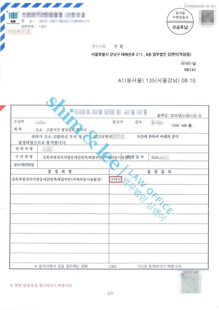 그럼에도 심앤이의 주장대로 의뢰인의 의사에 반해 성적 수치심을 줄 수 있는 부위를 촬영을 했다는 점이 인정되어, 가해자에게는 카메라이용촬영 혐의로 벌금 700만 원의 구약식 처분이 내려졌습니다.