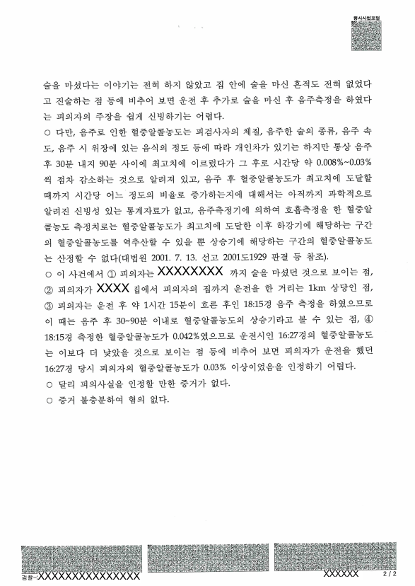 이에 이정도 변호사는 의뢰인의 최종음주시각에 대한 주장과 자료를 정리하여 음주운전 시점이 혈중알코올농도의 상승시점에 해당할 여지가 충분하고(의뢰인이 음주 시작 및 종료 시각과 어느 시기에 집중적으로 음주를 했는지도 중요하며 '의심스러울 때는 피고인의 이익으로'라는 형사법의 대원칙에 따라 의뢰인에게 유리하게 음주 종료 시각에 집중적으로 음주를 하였다고 가정하여 판단해야 함을 주장해야 합니다), 상승기임을 감안할 때 실제 측정된 혈중알코올농도보다 운전 당시의 혈중알코올농도가 더 낮을 가능성이 충분함을 피력하였습니다.