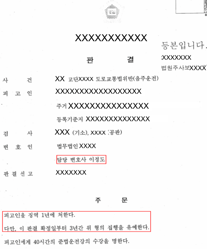 이에 따라 법원은 저의 변소취지를 받아들여 피고인에 대하여 "징역 1년 집행유예 3년"의 형을 선고하였습니다. 법원이 음주운전 재범에 관하여 엄격히 판결하고 있는 추세에 비하여 상당히 선처를 받은 경우였고, 법정구속될까 노심초사하던 의뢰인도 안도의 한숨을 내쉴 수 있었습니다.