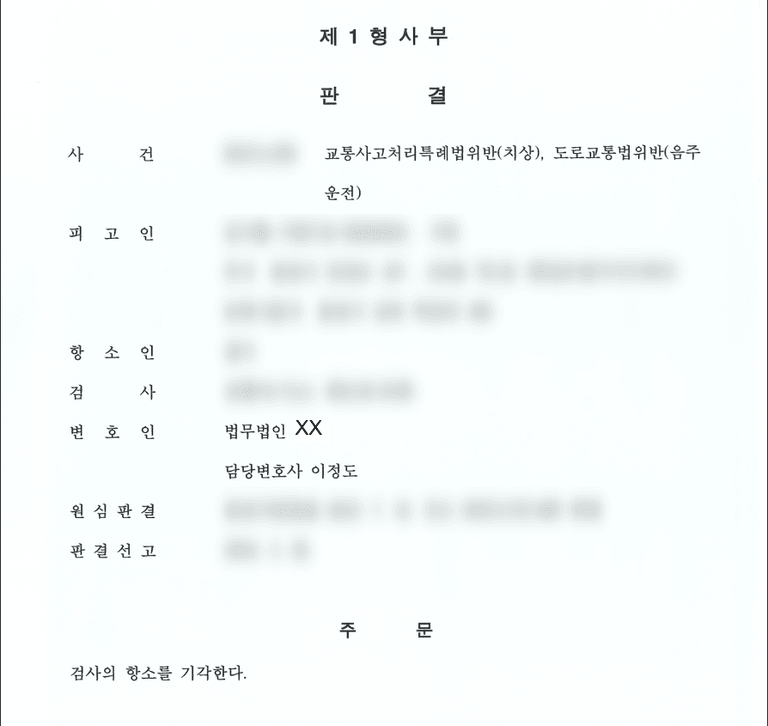 그 결과 1심 법원에서 음주운전 혐의에 대해서는 무죄 판결을, 교통사고처리특례법 위반에 대해서는 공소 기각 판결을 이끌어 낼 수 있었습니다.