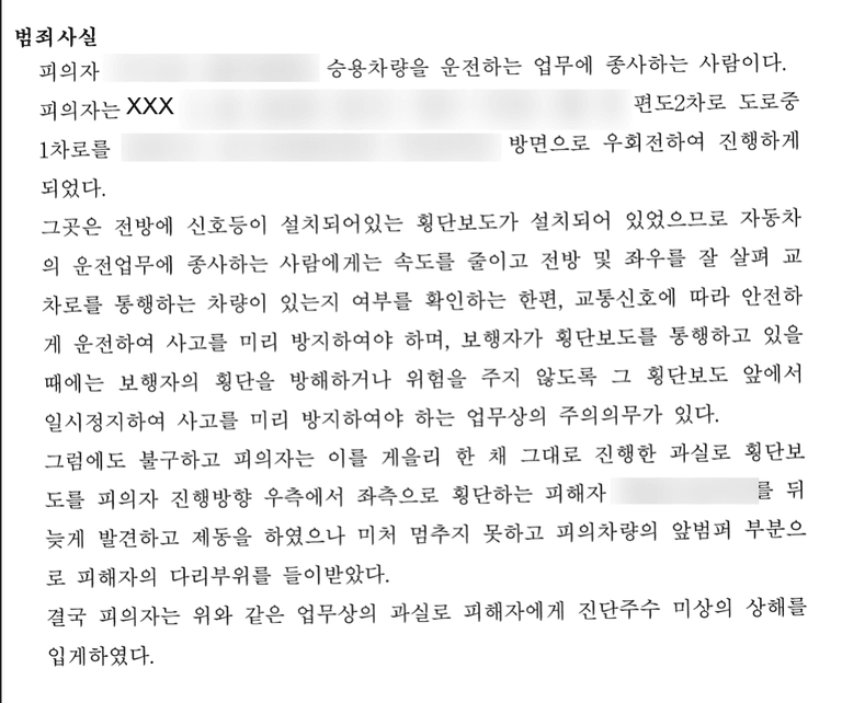 2024년 4월, 피의자 구 씨는 교차로에서 운전 중 우회전을 하다 횡단보도를 건너던 피해자 박씨를 차량 앞범퍼로 들이받아 상해를 입혔습니다. 당시 사고가 발생한 교차로는 신호등과 횡단보도가 설치된 곳으로 운전자는 보행자 보호를 위해 일시 정지 및 안전운전을 해야 할 의무가 있었습니다. 그러나 구 씨는 이를 충분히 준수하지 못하고 횡단보도를 건너던 피해자를 뒤늦게 발견하여 급히 제동했지만 충돌을 피하지 못했습니다.