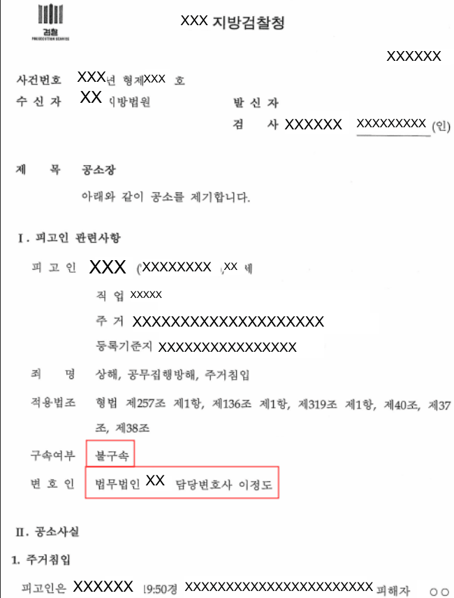 의뢰인이 현핸범인체포 후 구속영장실질심사에서 구속청구기각 결정을 받은 내용이 기재된 공소장입니다.