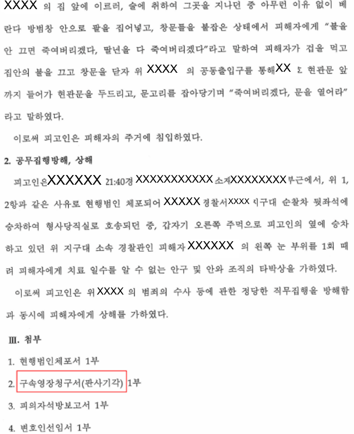 구속영장청구서입니다. 보통 법원당직실을 통해 팩스로 전송받습니다.