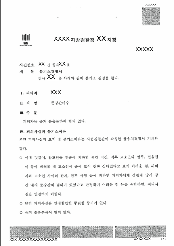 결론적으로, 경찰은 저의 변소 취지를 받아들여, "피의자에 대하여 혐의사실을 입증할 증거불충분하여 불송치 한다" 라며, 피의자에 대한 준강간미수에 대하여 불송치 결정(증거불충분)을 하였습니다(고소인은 준강간으로 고소하였으나 준강간미수로 혐의사실을 정리한 것으로 보입니다). 이에 대하여 고소인이 이의신청을 하였으나 검찰 역시 추가 수사 끝에 혐의없음(증거불충분) 처분을 하였습니다.