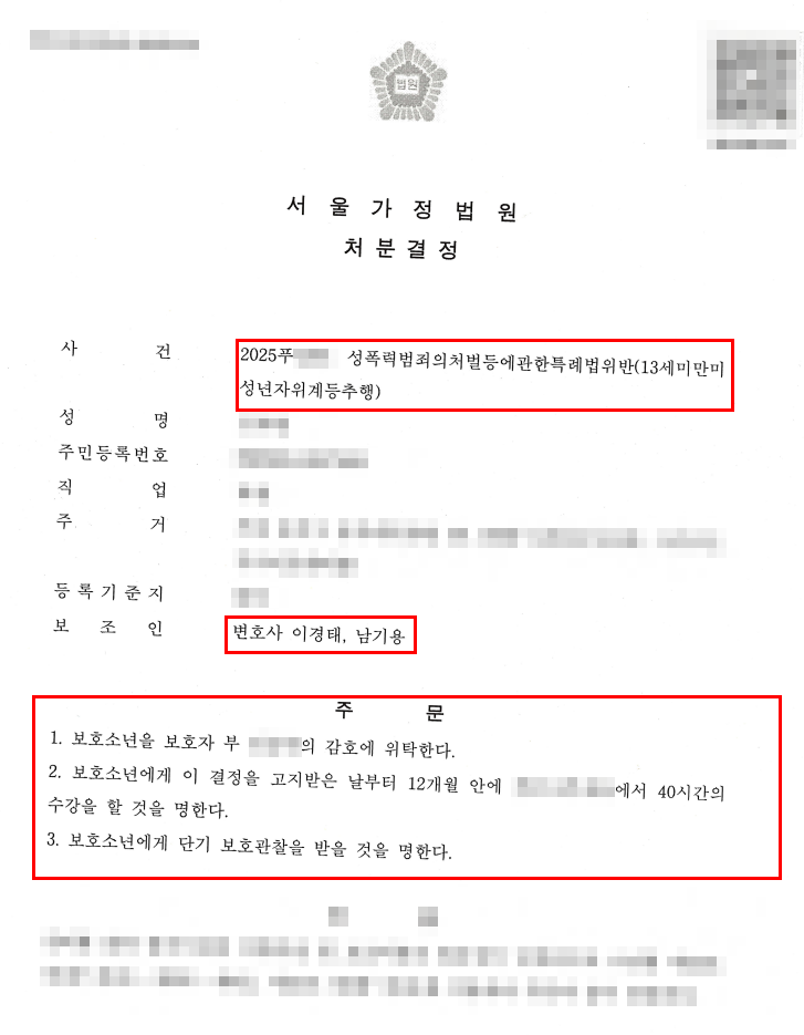최근 성범죄에 대한 처벌이 강화되고 있는 상황, 소년범죄에 대하여도 높은 수위의 처분이 선고되는 상황, 의뢰인에게 의율된 죄명은 5년 이상의 유기징역형으로 법정되어 있는 상황에서 소년분류심사원 위탁 또는 소년원 송치가 예상됨에도 피해자와 합의, 기타 의뢰인에게 유리한 양형요소를 변론하여 소년보호처분 1, 2, 4호로 마무리될 수 있었습니다.
