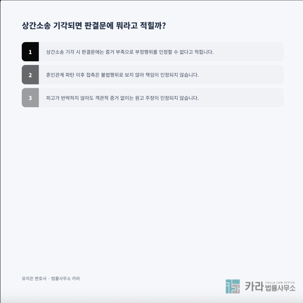 그래서 상간소송이 기각되면 판결문에는 보통“부정행위 인정 증거 부족 → 손해배상 책임 부정”이라는 구조로 정리되는 경우가 일반적입니다.