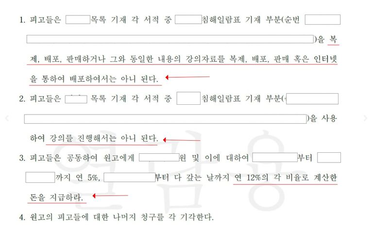 승소하여 복제 금지, 강의 금지 등의 판결과 손해배상의 판결을 받아냈습니다.