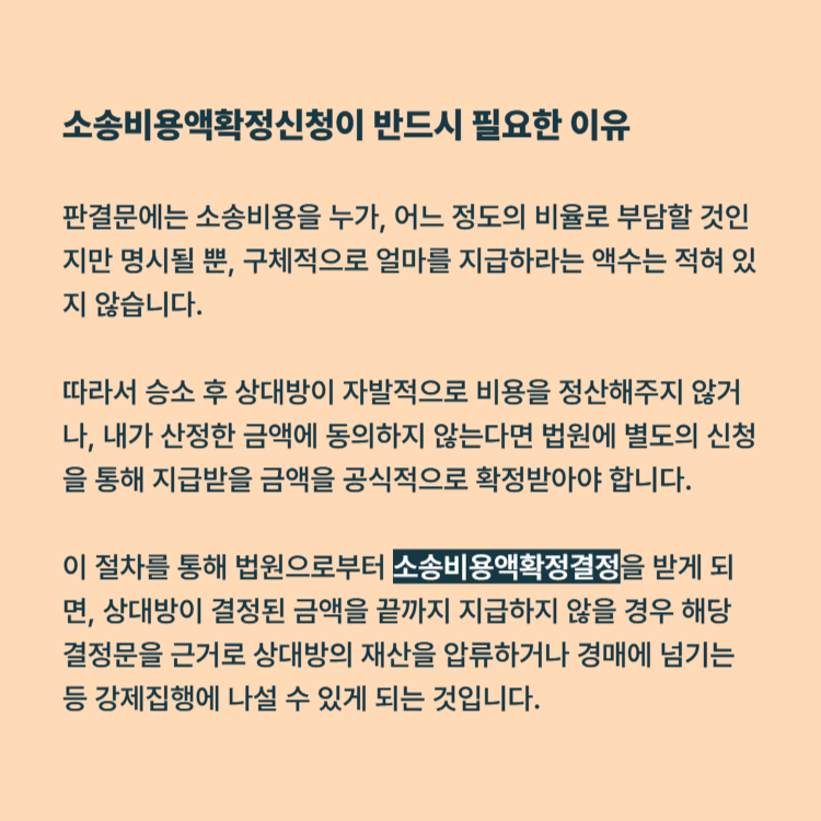 판결문에는 소송비용을 누가, 어느 정도의 비율로 부담할 것인지만 명시될 뿐, 구체적으로 얼마를 지급하라는 액수는 적혀 있지 않습니다. 따라서 승소 후 상대방이 자발적으로 비용을 정산해주지 않거나, 내가 산정한 금액에 동의하지 않는다면 법원에 별도의 신청을 통해 지급받을 금액을 공식적으로 확정받아야 합니다.