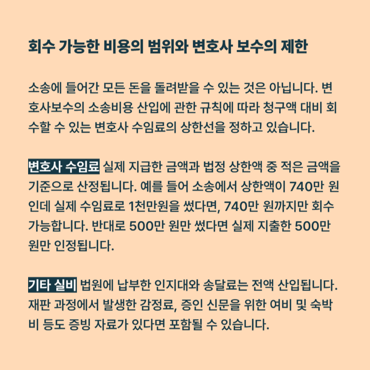 변호사 수임료: 실제 지급한 금액과 법정 상한액 중 적은 금액을 기준으로 산정됩니다. 예를 들어 소가가 1억 원인 소송에서 상한액이 740만 원인데 실제 수임료로 1,000만 원을 썼다면, 740만 원까지만 회수 가능합니다. 반대로 500만 원만 썼다면 실제 지출한 500만 원만 인정됩니다.