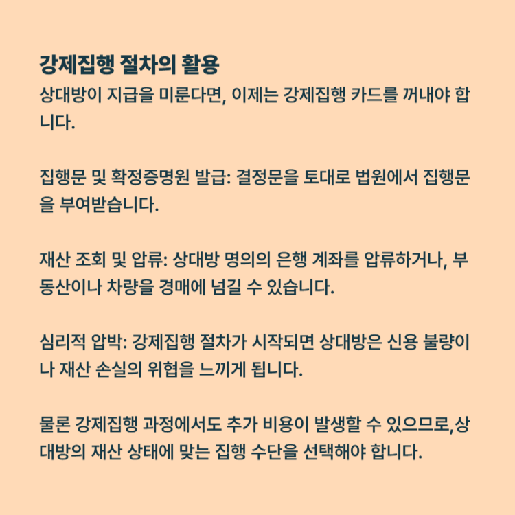 심리적 압박: 강제집행 절차가 시작되면 상대방은 신용 불량이나 재산 손실의 위협을 느끼게 되어, 결국 백기를 들고 비용을 지급하는 경우가 많습니다.