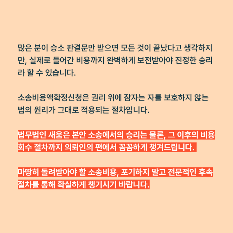 법무법인 새움은 본안 소송에서의 승리는 물론, 그 이후의 비용 회수 절차까지 의뢰인의 편에서 꼼꼼하게 챙겨드립니다. 마땅히 돌려받아야 할 소송비용, 포기하지 말고 전문적인 후속 절차를 통해 확실하게 챙기시기 바랍니다.