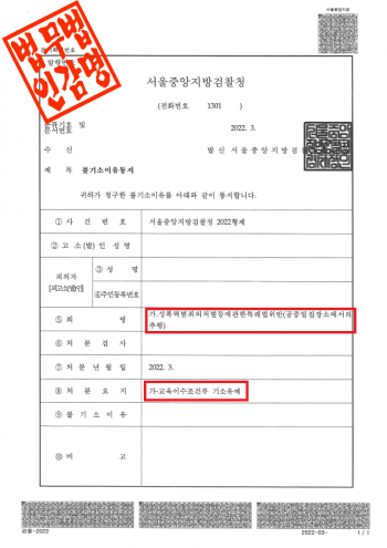 서울중앙지방검찰청은 이 사건에 대해 다음과 같은 사유로 불기소 처분을 하였습니다.