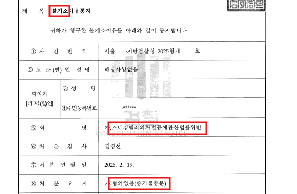 사건은 결국 스토킹불기소 처분으로 종결되었고, 의뢰인은 형사처벌의 위험에서 벗어나 일상으로 돌아갈 수 있게 되었답니다.