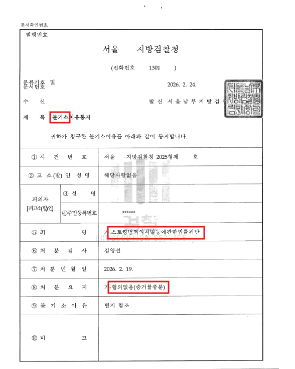 그 결과, 의뢰인에 대해 최종적으로 스토킹 혐의없음 처분이 내려졌습니다.