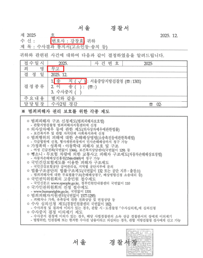 그래서 우선은 원 사건에서 혐의를 벗는 것이 가장 중요하다고 설명드렸고, 의뢰인에게 “불송치가 나오면 그때 무고죄 고소도 도와드리겠다”고 말씀드렸습니다.