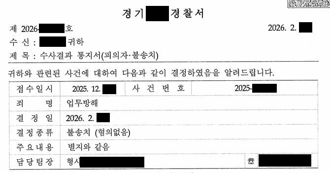 경찰에서는 위 변호인의 주장을 그대로 받아들여 불송치(혐의없음) 결정을 내렸습니다.