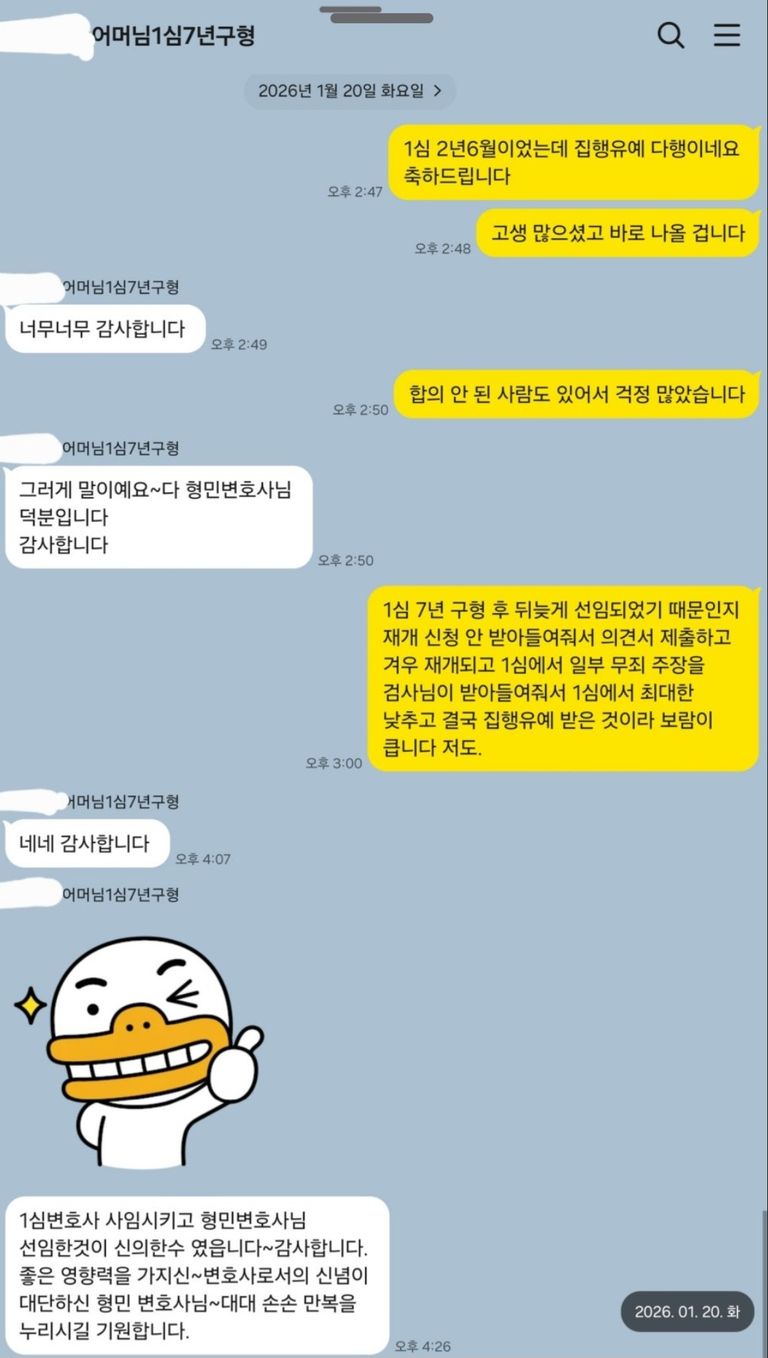 항소심에서 1명을 추가로 합의하기는 하였으나 합의가 되지 않은 아동청소년 피해자가 남아 있어서 걱정되었습니다. 그럼에도 불구하고 항소심에서 집행유예로 석방될 수 있었습니다. 물론 합의 과정도 쉽지 않았는데 최대한 낮은 금액으로 합의가 성사되게 하기 위해 최선을 다하였습니다.