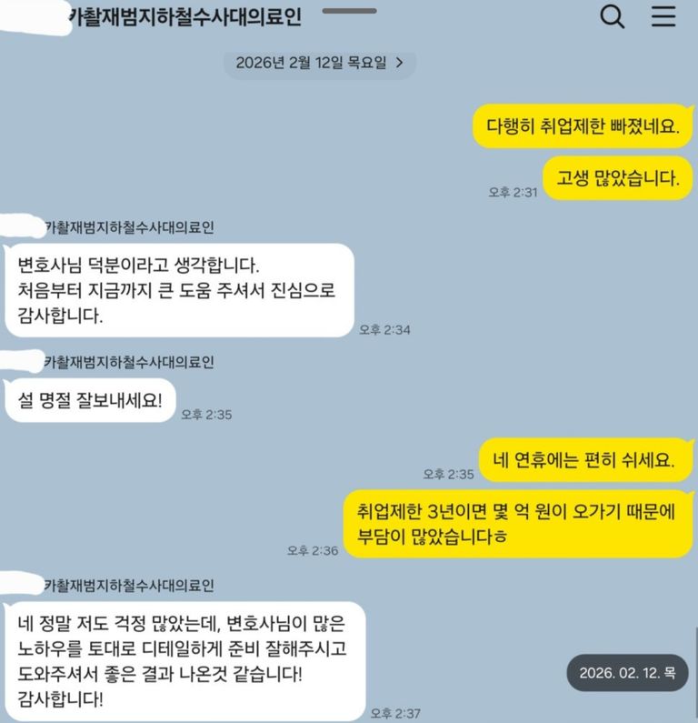 직업상 취업제한이 내려지면 안 되기 때문에 정식재판청구로 다투었습니다. 판사님께 벌금 액수가 늘어나는 것은 마땅히 감수하겠으나 취업제한만은 면제해주실 것을 간곡히 주장하였습니다. 의뢰인에게는 어르신분들에게 무료 진료봉사를 하는 것을 사진 찍고 감사 편지를 받아서 보내달라고 하였습니다. 제출하면서 직업상 할 수 있는 봉사가 있는데 취업제한이 내려지면 할 수 없다는 점, 한 번의 선처를 내려주신다면 계속 진료봉사를 이어가겠다는 점을 호소하였습니다.