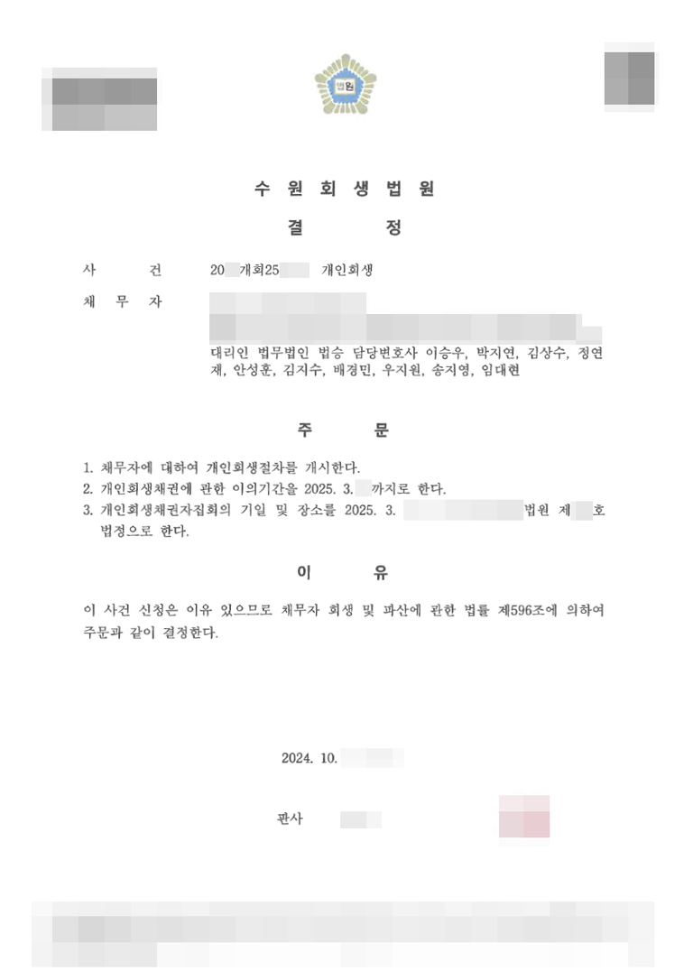 의뢰인의 직업 특수성과 회사의 사정으로 급여 소득이 3개월간 지속적으로 감소된 점을 평균 소득을 낮게 책정하여 제출하였고 보정없이 4일만에 개시결정을 받을 수 있도록 도와드렸습니다.