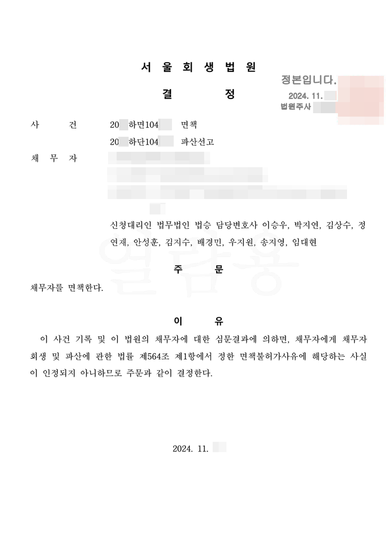 의뢰인은 폐업한 사업장이 세 곳이나 있었고 이와 관련된 모든 내용을 철저히 소명하였으며, 과거에 소유했던 부동산 역시 경매로 매각되었음을 명확히 입증하였습니다. 모든 사항을 성실하게 소명하여 3개월 만에 신속한 면책 결정을 받을 수 있도록 도와드렸습니다.