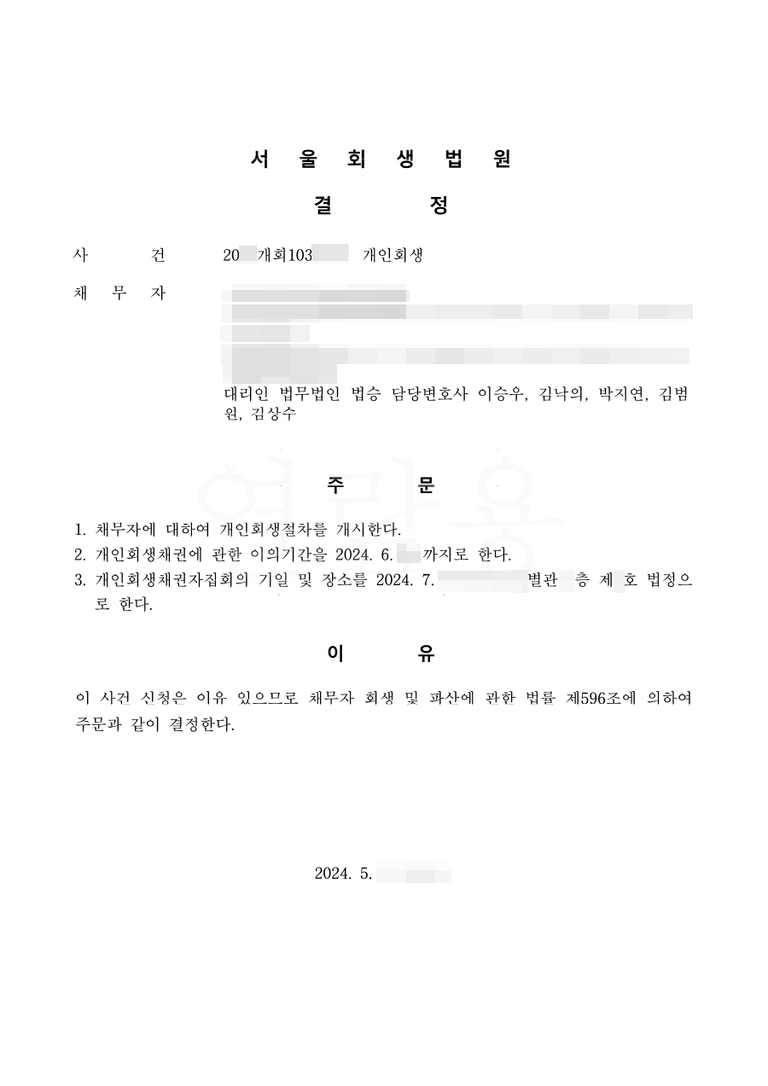 그렇게 낙담하던 차에 우연히 개인회생 제도를 알게 되어 마지막으로 간절한 마음을 담아 법무법인 법승에 사건을 의뢰하게 되었습니다.
