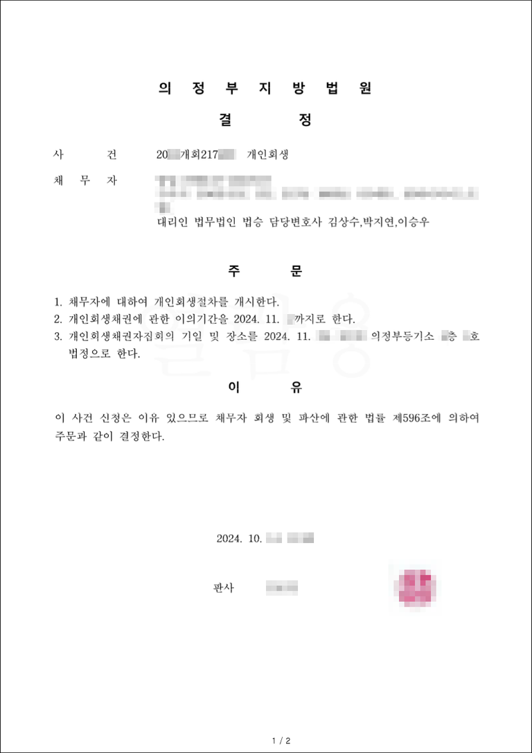 배우자 재산 본인 재산에 반영, 변제금 상향 등의 보정권고 없이 개시결정을 받을 수 있도록 도와드렸습니다.