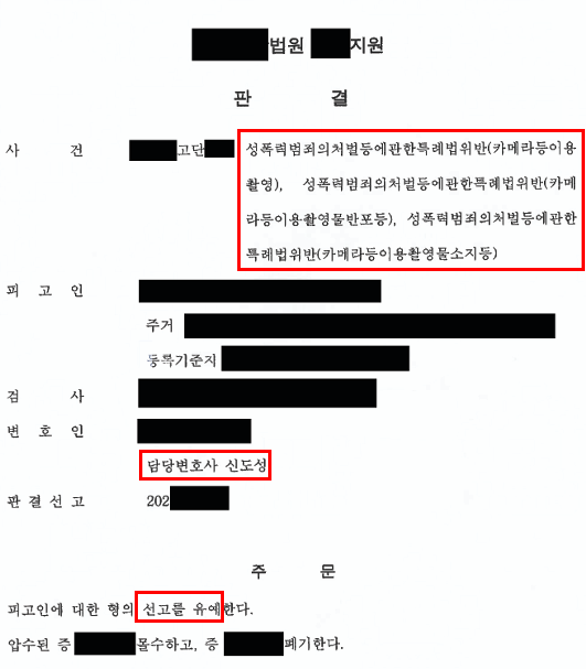 [성공사례] 카메라등이용촬영죄, 촬영물 상영, 소지 혐의에 대하여 ‘선고유예’를 이끌어낸 사례