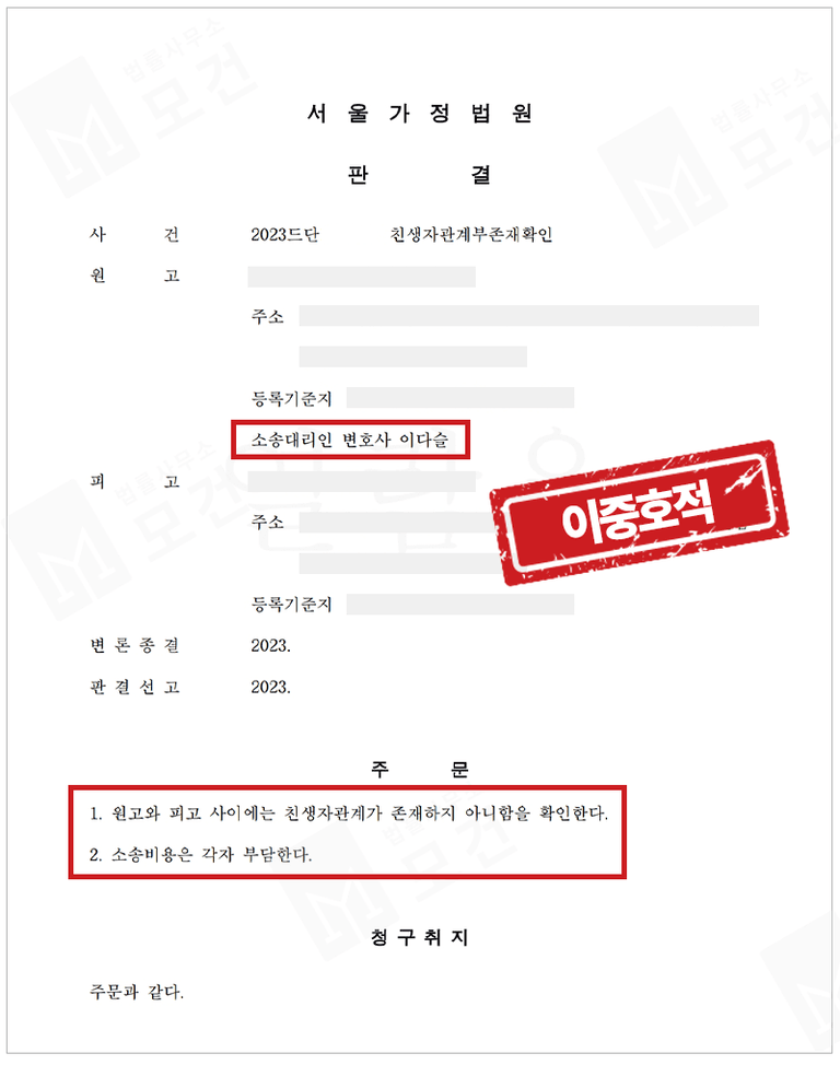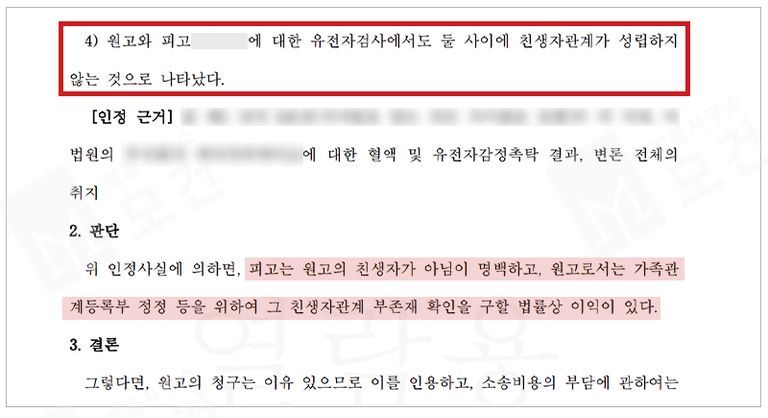 이러한 근거있는 주장이 뒷받침 됨에 따라 법원은 '원고와 피고 사이에는 친생자관계가 존재하지 아니함을 확인한다'며 원고의 청구를 받아들여주었습니다