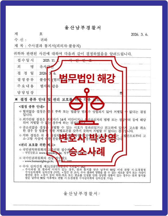 저희 법무법인 해강에서는 법리적 검토와 준비서면 등을 통하여 의뢰인의 맞는 법률 조력을 하고자 노력하였고 [무혐의 불송치]성공 하였습니다.