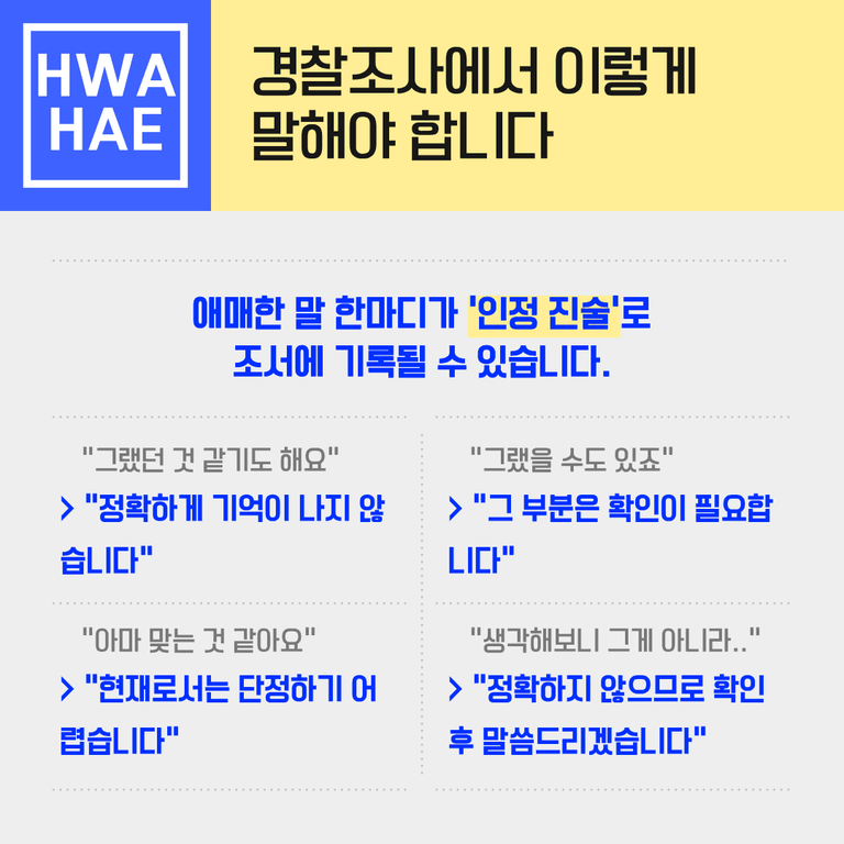 따라서 기억이 나지 않는다면 분명하게 기억이 나지 않는다고 말씀하셔야 합니다. 정확한 확인이 필요한 부분이라면 지금은 확인이 어렵다고 답하는 것이 맞습니다. 또한 질문이 불리하거나 답변하기 곤란한 경우에는 진술거부권을 행사하는 것도 법적으로 보장된 권리입니다.