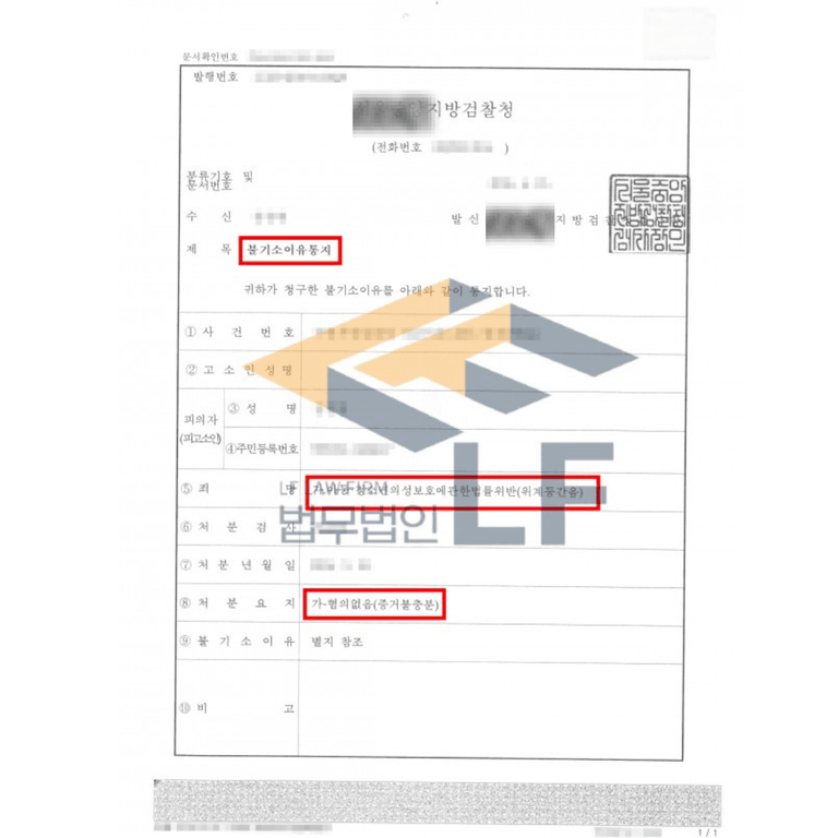 검찰에서는 본 변호인의 주장을 수용하여 의뢰인에 혐의없음(무혐의) 처분을 내렸습니다.