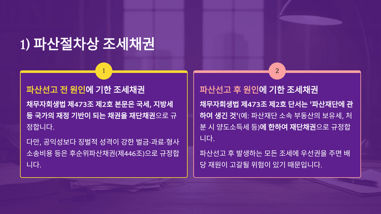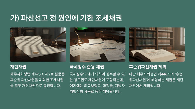 파산절차에서 채권은 파산채권, 재단채권, 별제권으로 구분되고, 파산채권은 다시 우선권 있는 파산채권, 일반 파산채권, 후순위 파산채권으로 나뉜다. 이 가운데 조세채권 등은 현행 채무자회생법 제473조 제2호에 따라, 후순위 파산채권에 해당하는 경우를 제외하고는 원칙적으로 재단채권으로 취급되므로, 일반 파산채권과 달리 파산절차 외에서 우선적으로 변제를 받을 수 있다.