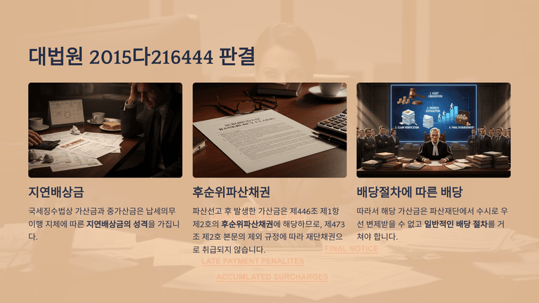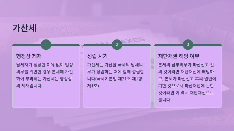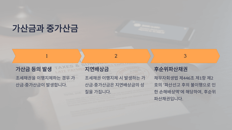 다만 조세채권과 관련하여 발생하는 모든 금액이 재단채권이 되는 것은 아니다. 파산선고 전의 원인으로 성립한 국세·지방세라 하더라도, 그 이행지체로 인하여 파산선고 후에 발생한 가산금·중가산금은 지연배상금의 성질을 가지므로 후순위 파산채권에 해당하고 재단채권에서 제외된다. 반면 신고의무 위반 등에 따라 본세에 가산되어 부과되는 가산세는 행정상 제재의 성격을 가지므로, 본세의 성질에 따라 재단채권으로 취급될 수 있다.