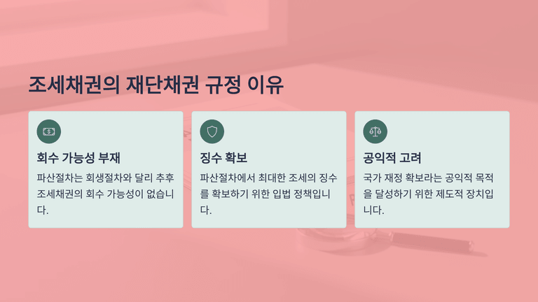 이처럼 파산절차에서 상당 범위의 조세채권을 재단채권으로 취급하는 이유는, 회생절차와 달리 파산절차에서는 추후 기업 존속을 전제로 한 회수 가능성이 없으므로 조세징수의 확보 필요성이 크기 때문이다. 또한 회생절차가 실패하여 파산으로 이행하는 견련파산의 경우에는 일반적으로 공익채권은 재단채권으로, 회생채권은 파산채권으로 전환되지만, 회생개시 전 성립한 조세채권이나 일반 파산채권보다 우선하는 공과금채권 등은 파산절차에서는 제473조에 따라 재단채권으로 취급될 수 있다.