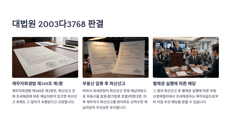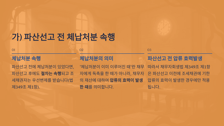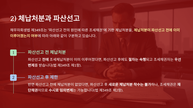 조세채권에 기한 체납처분은 파산선고 전후에 따라 효력이 다르다. 파산선고 전에 이미 압류의 효력이 발생한 경우에는 그 체납처분은 파산선고 후에도 속행될 수 있고, 조세채권자는 그 절차에서 우선변제를 받을 수 있다. 그러나 파산선고 전에 아직 체납처분에 이르지 않은 조세채권에 대하여는 파산선고 후 새롭게 체납처분에 착수할 수 없고, 다만 그 채권이 재단채권인 이상 파산절차와 별도로 수시 변제를 받을 수 있다.