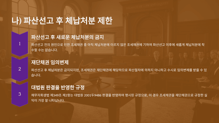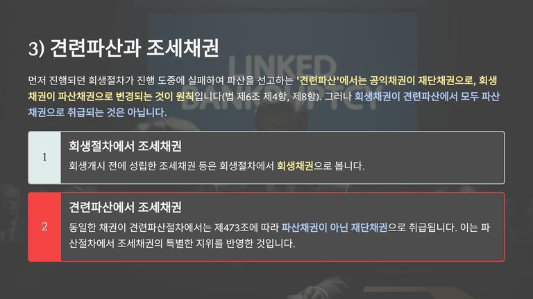 기업파산절차 중 "파산에서 조세채권의 취급"에 대한 안내입니다.