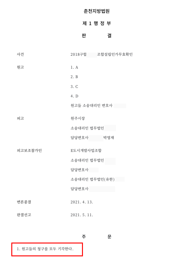 ①사건명 : 조합설립인가 무효 주장 전면 기각 / 조합설립인가무효확인 [피고 대리]