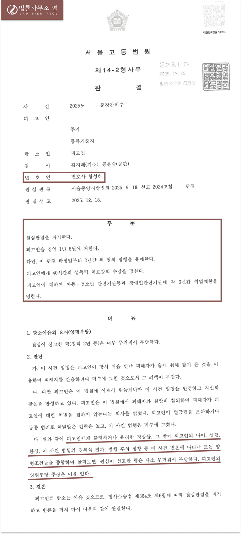 실제로 성범죄 사건에서 1심 실형이 선고된 이후 항소심에서 집행유예로 뒤집히는 것은 결코 쉬운 일이 아닙니다.