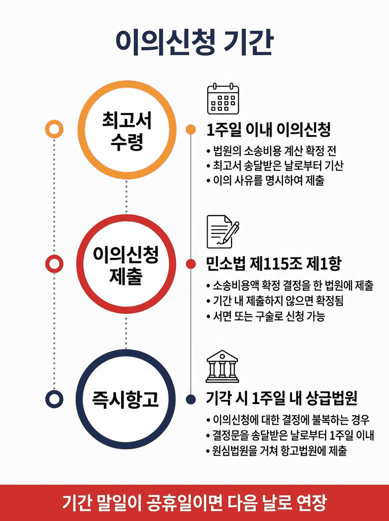 이의신청이 기각되더라도, 민사소송법 제115조 제2항에 따라 즉시항고를 1주일 이내에 상급법원에 제기할 수 있습니다. 기간 계산 시 민사소송법 제173조에 따라 말일이 공휴일인 경우 다음 날로 연장됩니다.