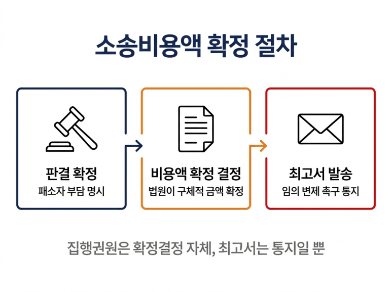 법원은 제출된 영수증·증빙을 심사해 구체적 금액을 결정하고, 이를 "소송비용액 확정 결정문"으로 패소자에게 통지합니다. 집행권원은 바로 이 확정 결정 자체이며, 원고는 이를 근거로 강제집행을 신청할 수 있습니다.