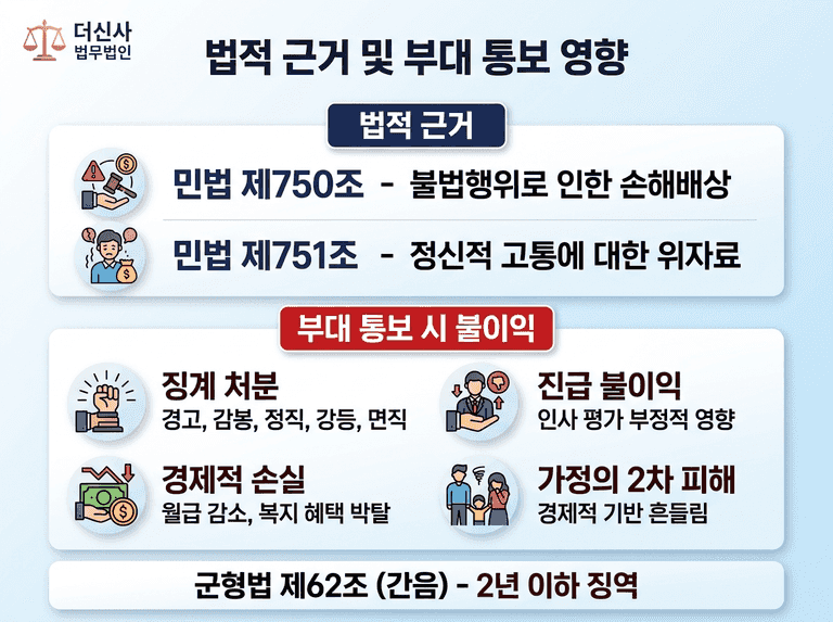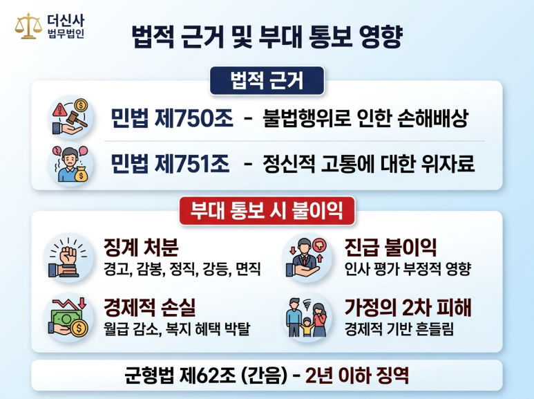 남편이 징계를 받거나 진급에 불이익을 받으면, 가정의 경제적 기반이 흔들리게 됩니다. 특히 이혼을 고려하지 않는 경우, 남편의 불이익은 곧 가정 전체의 손실로 이어져, 배우자 역시 2차 피해를 입게 됩니다.