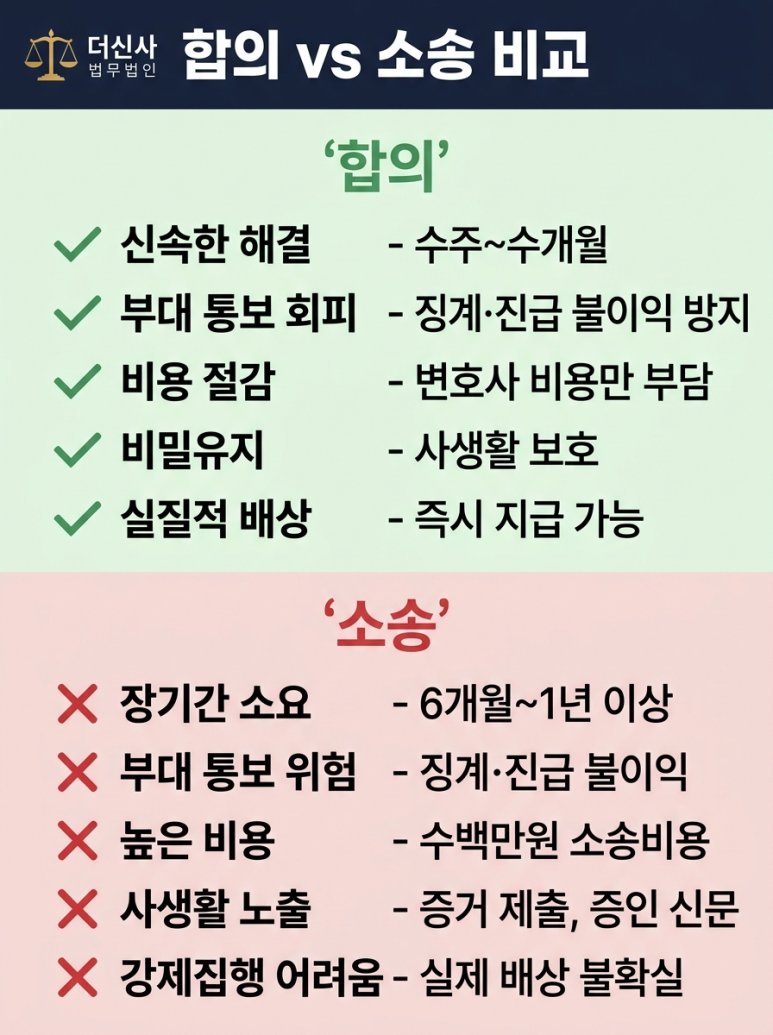 소송은 변호사 비용, 인지대, 송달료 등 최소 수백만 원의 비용이 발생합니다. 반면 합의는 변호사 비용만 부담하면 되므로, 경제적 부담이 훨씬 적습니다.